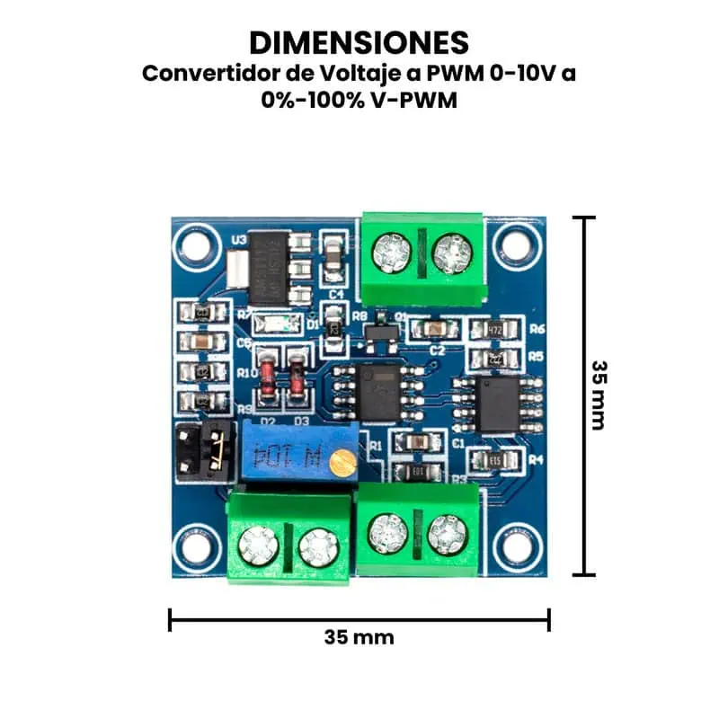 El Convertidor de Voltaje a PWM 0-10V a 0%-100% V-PWM es un dispositivo electrónico que transforma una señal analógica de control de 0 a 10 voltios en una señal PWM (modulación por ancho de pulso) proporcional, que varía entre 0% y 100% de ciclo de trabajo. Su función principal es permitir que sistemas o controladores que operan con señales analógicas puedan regular dispositivos que requieren señales PWM. El funcionamiento se basa en medir el voltaje de entrada y generar una señal digital pulsante cuya duración de encendido (duty cycle) es directamente proporcional a dicho voltaje: a 0 V corresponde 0% PWM (sin señal), y a 10 V corresponde 100% PWM (señal completamente activa). De esta forma, el convertidor actúa como un puente entre el control analógico y el control digital por pulsos, manteniendo una respuesta lineal y precisa.