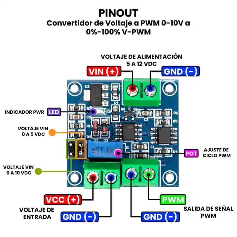 El Convertidor de Voltaje a PWM 0-10V a 0%-100% V-PWM se utiliza ampliamente en aplicaciones de automatización industrial, control de iluminación, ventilación, bombas, y sistemas de climatización (HVAC), donde se requiere convertir una señal analógica estándar en una señal PWM para controlar la velocidad, intensidad o potencia de un dispositivo. También es muy útil en proyectos de electrónica y robótica, permitiendo que sensores o controladores con salida de 0-10 V regulen módulos o actuadores que funcionan mediante modulación por ancho de pulso. Es compatible con la mayoría de las tarjetas de desarrollo, como Arduino, Raspberry Pi, ESP32, STM32, y PLCs industriales, siempre que se respete el nivel lógico de salida PWM y la alimentación del módulo.