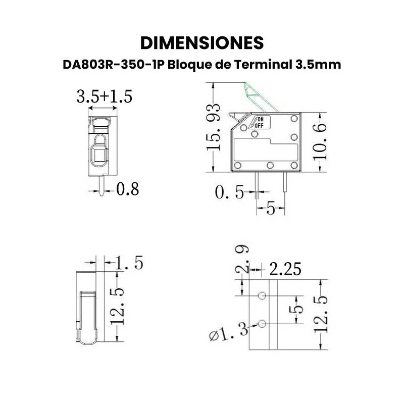 El DA803R-350-1P es un componente electrónico utilizado para conectar de forma segura cables de alimentación a una placa de circuito. Es un conector de tipo “palanca” o “prensa” (push-in/wrench-type) diseñado para un cableado rápido y sin esfuerzo, lo que ahorra mano de obra. Cuenta con un diseño de una sola posición (indicado por “1P”) y tiene pines de doble fila de baja altura para ahorrar espacio en la PCB.