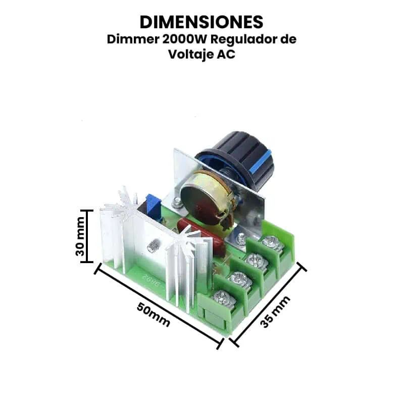 El Dimmer 2000W Regulador de Voltaje AC se utiliza en una amplia variedad de aplicaciones donde es necesario modular la potencia entregada a dispositivos de corriente alterna (AC), como lámparas incandescentes, resistencias calefactoras, motores universales, herramientas eléctricas, y ventiladores industriales o domésticos. Es ideal para proyectos de automatización del hogar, sistemas de control de temperatura, iluminación regulable, o control de velocidad en motores de AC, permitiendo un ajuste manual o programado de la energía suministrada. Este dimmer es compatible con elementos electrónicos como cargas resistivas (ej. focos, calentadores), y en ciertos casos con cargas inductivas de baja potencia (como algunos ventiladores), siempre que no se exceda su capacidad nominal de 2000W.