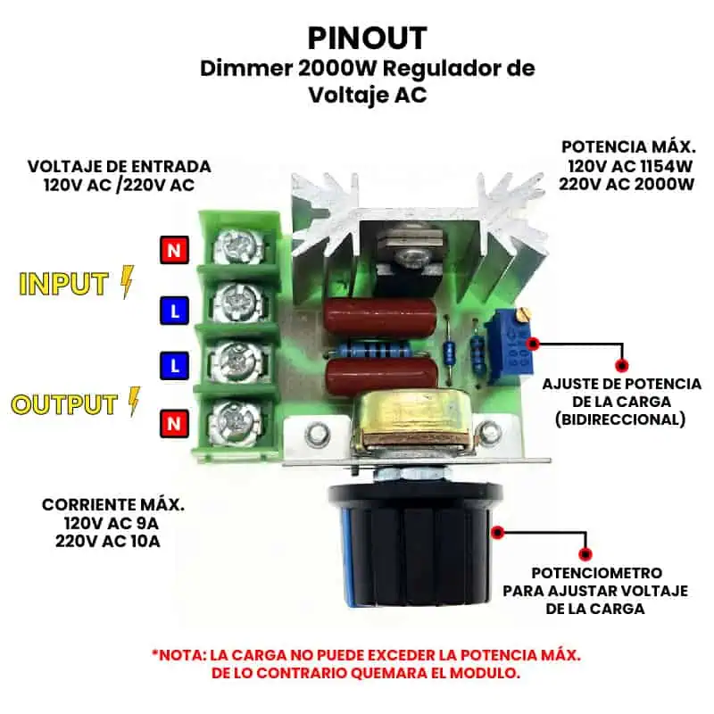 La tensión de salida máxima es igual a la tensión de entrada, por ejemplo, si la entrada es de 110 VCA, la tensión de salida máxima es de 110 VCA la potencia de carga resistiva debe ser inferior a 2000 W, y la potencia debe ser mayoritariamente reducido (la mitad o más) para cargas inductivas o capacitivas, de lo contrario el controlador y la carga se quemarán.