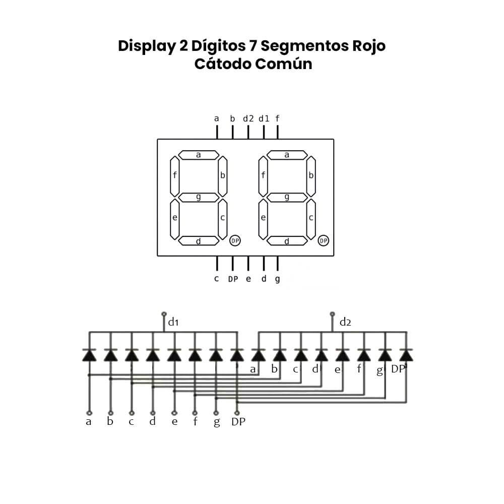 Display 2 dígitos 7 segmentos disponible en Ánodo común y Cátodo común, ambos son de color rojo. Estos son dispositivos optoelectrónicos que permite visualizar números del 0 al 9 con 2 dígitos y punto decimal.