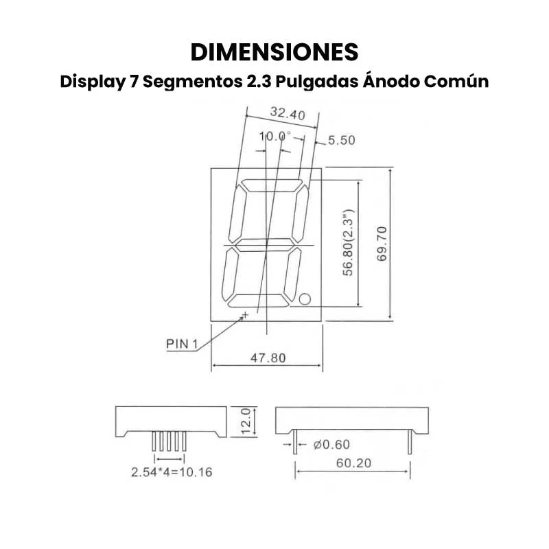 El Display 7 segmentos 2.3″ Ánodo Común es un componente optoelectrónico que utiliza siete segmentos luminosos (generalmente LED) para formar dígitos del 0 al 9, además de un punto decimal. Sirve para mostrar información numérica de forma clara y simple, y se usa comúnmente en aplicaciones como relojes digitales, calculadoras, marcadores, medidores de temperatura, básculas y paneles de instrumentación.