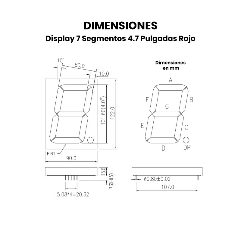 El tamaño de 4.7 Pulgadas indica que es un display grande, ideal para visualización de dígitos a distancia. Contamos con su configuración en Cátodo Común y Ánodo Común.