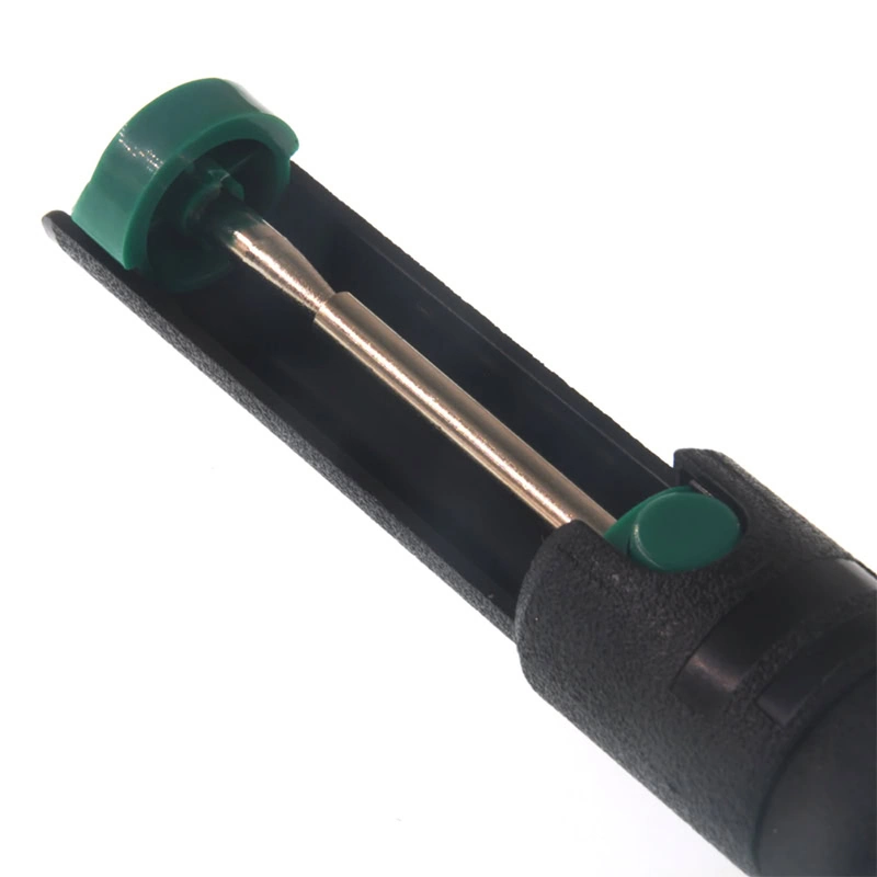 El Desoldador de Succión DP-366D es una herramienta manual diseñada para retirar estaño fundido de tarjetas electrónicas y puntos de soldadura de forma rápida y limpia. Funciona mediante un sistema de vacío con resorte de alta potencia, que al presionar el botón genera una succión para absorber la soldadura derretida sin dañar las pistas ni los componentes. Su punta resistente al calor y su cuerpo ergonómico permiten trabajar con comodidad y exactitud en tareas de reparación o ensamblaje electrónico.