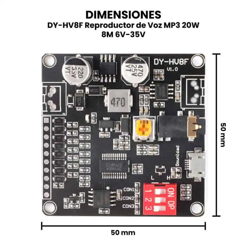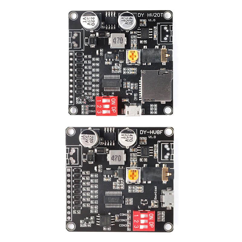 Los módulos DY-HV8F / DY-HV20T Reproductores de Audio MP3 20W se venden por separado, admiten formato MP3 y decodificación WAV. El módulo DY-HV8F tiene un almacenamiento flash de 8M bytes, incorpora un conector MicroUSB para cargar archivos de música directamente. El módulo DY-HV20T incorpora un conector de memoria SD que permite tener un almacenamiento de hastan 32 G bytes, también incorpora un conector MicroUSB, que facilitará la carga de archivos a la memoria SD. Estos reproductores de audio integran disipador de segmento IO, control de puerto serial UART, control de puerto seria de bus único ONE line, MP3 estándar y otros 7 modos de trabajo, configuración de interruptor DIP. Además tienen un circuito amplificador de potencia clase D de 20 W, con salidas de altavoces de 4 Ω 20 W y 8 Ω 10 W.