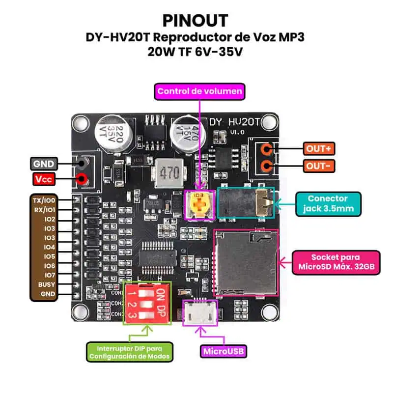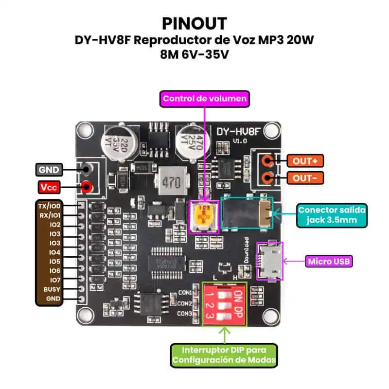 Los DY-HV8F / DY-HV20T Reproductores de Audio MP3 20W se utilizan en una amplia variedad de proyectos y sistemas de sonido, tanto caseros como profesionales. Son ideales para bocinas activas, reproductores portátiles, sistemas de audio DIY, paneles publicitarios, kioscos interactivos, automóviles y equipos de entretenimiento. Gracias a su capacidad de reproducir música desde USB, microSD o Bluetooth, permiten crear soluciones autónomas sin necesidad de dispositivos externos. Además, su amplificador integrado de 20 W facilita su uso en proyectos donde se requiere potencia y simplicidad, eliminando la necesidad de componentes adicionales. Por su bajo consumo, tamaño compacto y versatilidad, también son muy empleados en prototipos educativos, equipos de anuncios por voz o alarmas con mensajes personalizados.