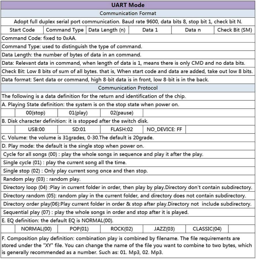 | Busy | Salida de nivel bajo (0 V) al reproducir una pista, salida de nivel alto (3,3 V) al final de la reproducción |