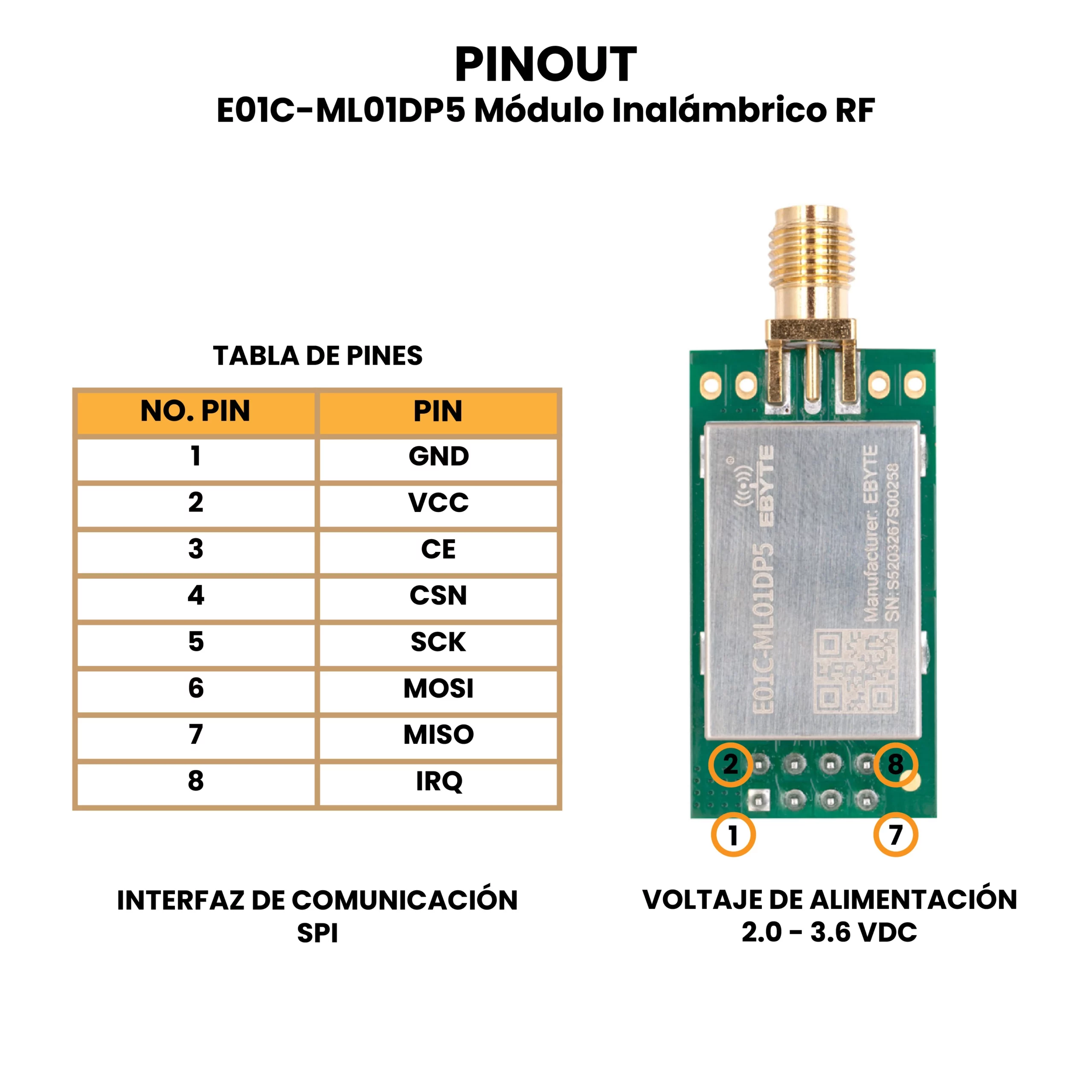 El E01C-ML01DP5 Módulo Inalámbrico RF se utiliza en aplicaciones de comunicación inalámbrica de datos donde se requiere bajo consumo y enlaces confiables en la banda de 2.4 GHz, como controles remotos, telemetría, redes de sensores, domótica, automatización industrial ligera, robots, enlaces punto a punto y proyectos IoT. Es compatible con tarjetas de desarrollo que dispongan de interfaz SPI y niveles lógicos de 3.3 V, como Arduino UNO, Nano y Mega (usando conversión de nivel), Arduino Due, ESP8266, ESP32, STM32 (Blue Pill, Nucleo), Raspberry Pi, Teensy.