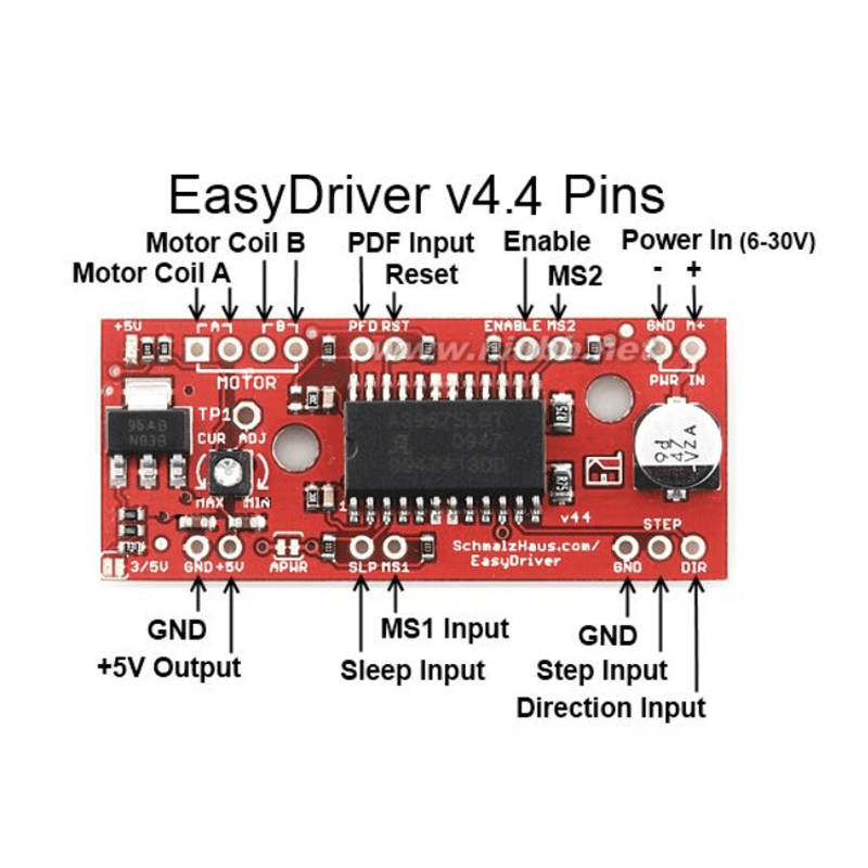 El Easy driver es un módulo que nos permite manipular motores a pasos bipolares de 4, 6 u 8 hilos. Esta diseñado a partir del CI A3967; puede trabajar con pulsos de 5V o 3.3V por lo que es muy versátil. Conecta tu microcontrolador al módulo y obtendrás un control del motor muy preciso. Posee dos pines de selección para ajustar la resolución de pasos del motor