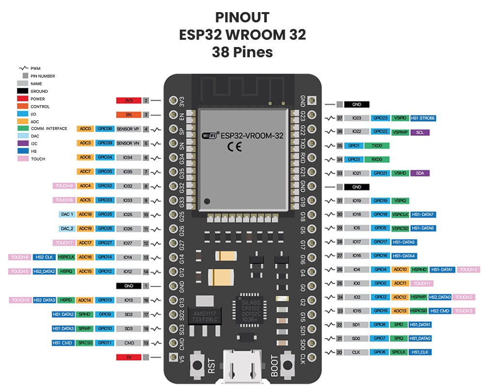 - Modelo: ESP32 38 Pines