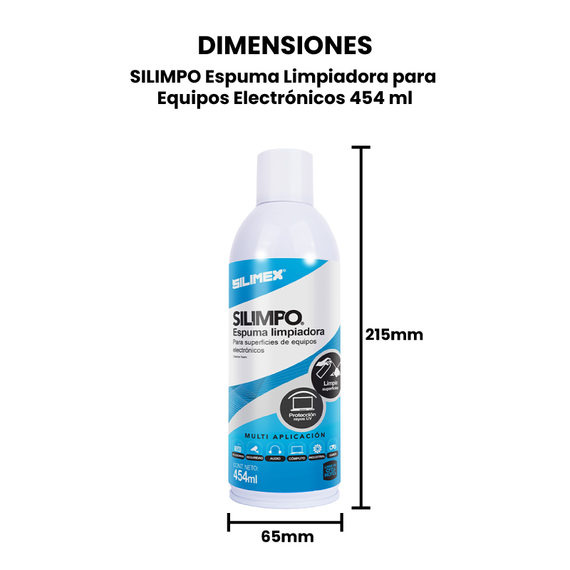 Silimpo es una espuma limpiadora diseñada para la limpieza externa de gabinetes y superficies de equipos electrónicos, como computadoras, dispositivos gamer, audio y sistemas de seguridad. Ofrece un acabado brillante, efecto antiestático y protección UV, además de un aroma agradable. Su fórmula soluble en agua y libre de CFC’s es fácil de usar: se aplica con una toallita de microfibra o cepillo suave para teclados, sin dejar residuos. Es seguro para equipos electrónicos y viene en un práctico envase de 454 ml.