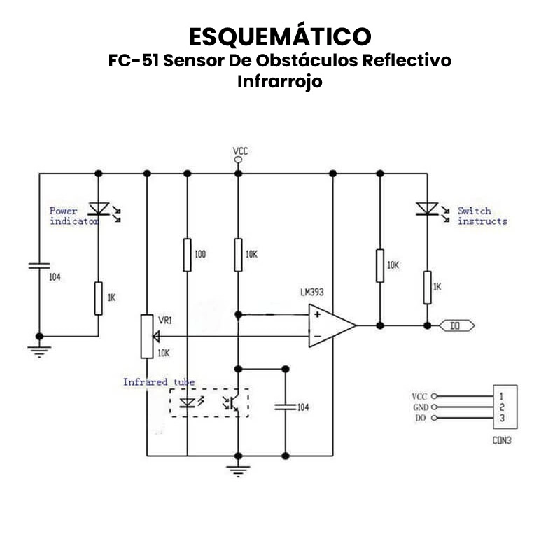 El FC-51 es un sensor de obstáculos reflectivo infrarrojo diseñado para detectar la presencia de objetos cercanos sin contacto físico, utilizando un sistema emisor-receptor basado en luz infrarroja. El módulo incorpora un LED infrarrojo (IR) que emite un haz de luz invisible, y un fototransistor receptor que detecta la luz reflejada por objetos próximos. Cuando un objeto entra en el rango de detección (ajustable mediante un potenciómetro integrado), parte de la luz infrarroja se refleja hacia el fototransistor, lo que cambia su estado de conducción y activa la salida digital del sensor (normalmente LOW cuando detecta un obstáculo).