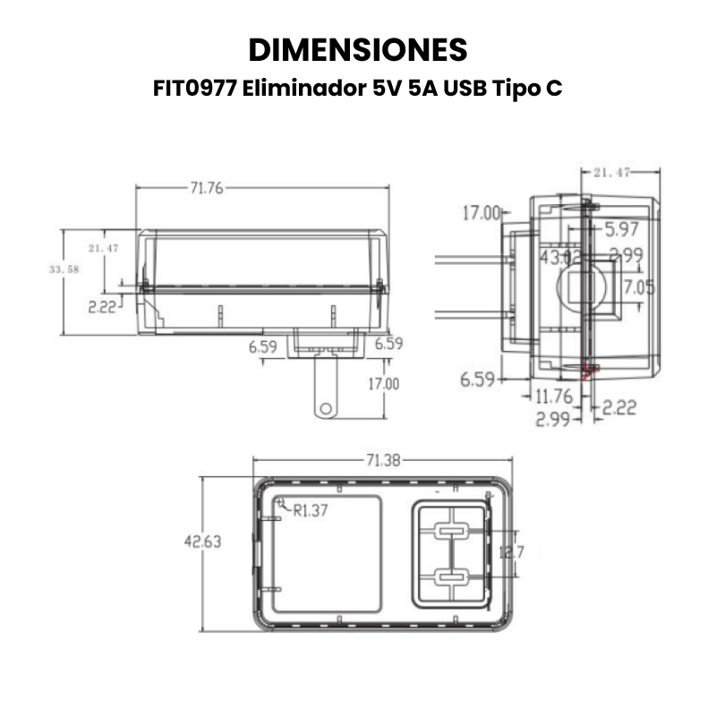 - Tamaño de la fuente de alimentación: 72mm x 43mm x 34 mm
