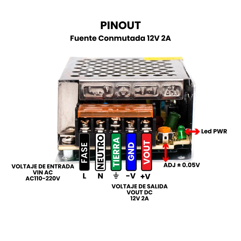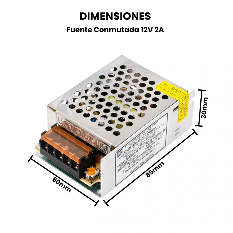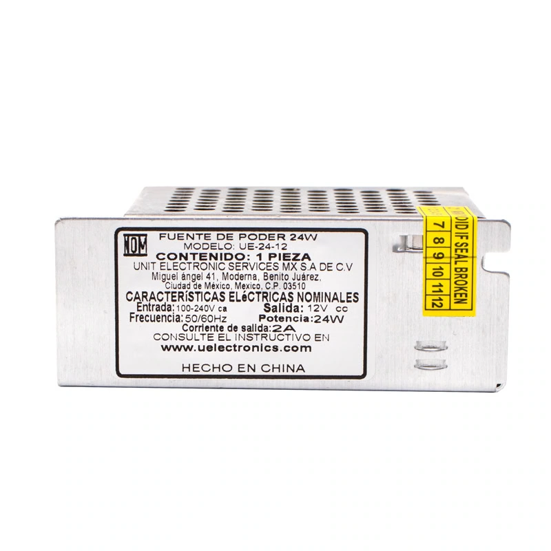 La Fuente Conmutada 12V 2A modelo UE-24-12 de UNIT Electronics convierte corriente alterna (110V-220V AC) en corriente directa (12V DC) de forma estable, ofreciendo hasta 2A de salida y 24W de potencia. Su diseño compacto con carcasa de metal y base de aluminio para una buena disipación de calor, ideal para proyectos electrónicos, tiras LED, cámaras de seguridad y otros dispositivos que requieran un suministro estable de energía.