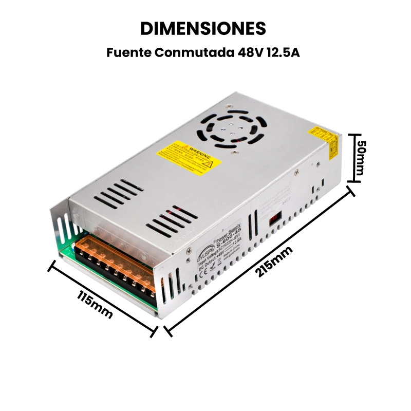 La Fuente Conmutada de 48V 12.5A es un dispositivo diseñado para convertir corriente alterna (AC) de 110V o 220V a corriente directa (DC) estable de 48V con una corriente máxima de 12.5 amperios. Este tipo de fuente utiliza tecnología conmutada, lo que la hace más eficiente y compacta que las fuentes lineales tradicionales, reduciendo el calor generado y el consumo de energía. Además, cuenta con protecciones contra sobrecarga, sobretensión y cortocircuito, para tener un funcionamiento seguro y estables en entornos exigentes.