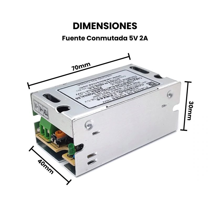 Este modelo cuenta con una carcasa metálica que ayuda a disipar el calor y proteger los componentes internos, además de terminales de conexión tipo clema para facilitar su conexión. Su tamaño es compacto permite integrarla fácilmente en tableros, cajas de control o proyectos de electrónica. Es una opción viable para aplicaciones en automatización, robótica, proyectos DIY o sistemas embebidos.