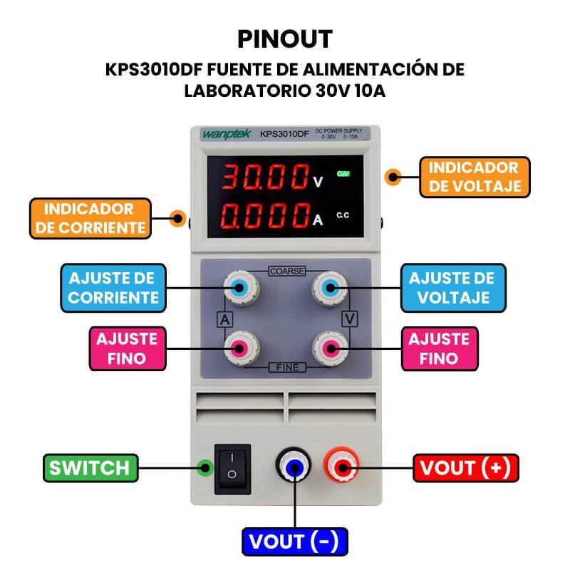 Fuente de alimentación ajustable para laboratorio modelo KPS3010DF con capacidad de voltaje de salida 30 V y corriente de hasta 10A, posee alta eficiencia, bajos niveles de fluctuación, alta estabilidad y son muy ligeras y compactas. KPS3010DF fuente de alimentación tiene circuitos limitadores de corriente que protegen la fuente de alimentación y las cargas, también tienen un circuito de control de temperatura con disipación de calor inteligente y bajos niveles de ruido, un Switch eléctrico de encendido y apagado y un ventilador para disipar calor.