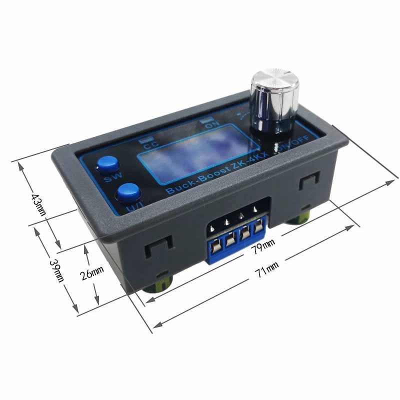 La Fuente de Alimentación ZK-4KX Buck Boost Regulable, es una fuente de alimentación conmutada capaz de aumentar (Boost) o disminuir (Buck) la tensión de entrada a los valores requeridos. Esta fuente incorpora un display que muestra voltaje y corriente, estos valores los podrás definir con el encoder que incorpora, también permite seleccionar el límite de corriente así como una potencia máxima de salida para evitar daños a la fuente.