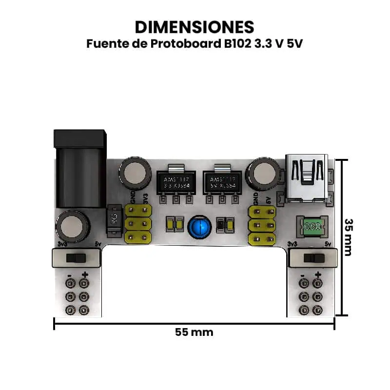 La Fuente de Protoboard B102 (3.3 V/5 V) es un módulo de alimentación diseñado para montarse en protoboards estándar, proporcionando de forma sencilla y segura dos salidas reguladas de voltaje (3.3 V y 5 V) a partir de una fuente de alimentación externa de entre 6.5 V y 12 V. Internamente utiliza reguladores lineales que estabilizan la tensión de entrada, y cuenta con indicadores LED para mostrar el estado de cada voltaje. El módulo permite seleccionar entre 3.3 V, 5 V o ambas salidas activas mediante pequeños interruptores, y suele ofrecer protección contra sobrecorriente y cortocircuitos.