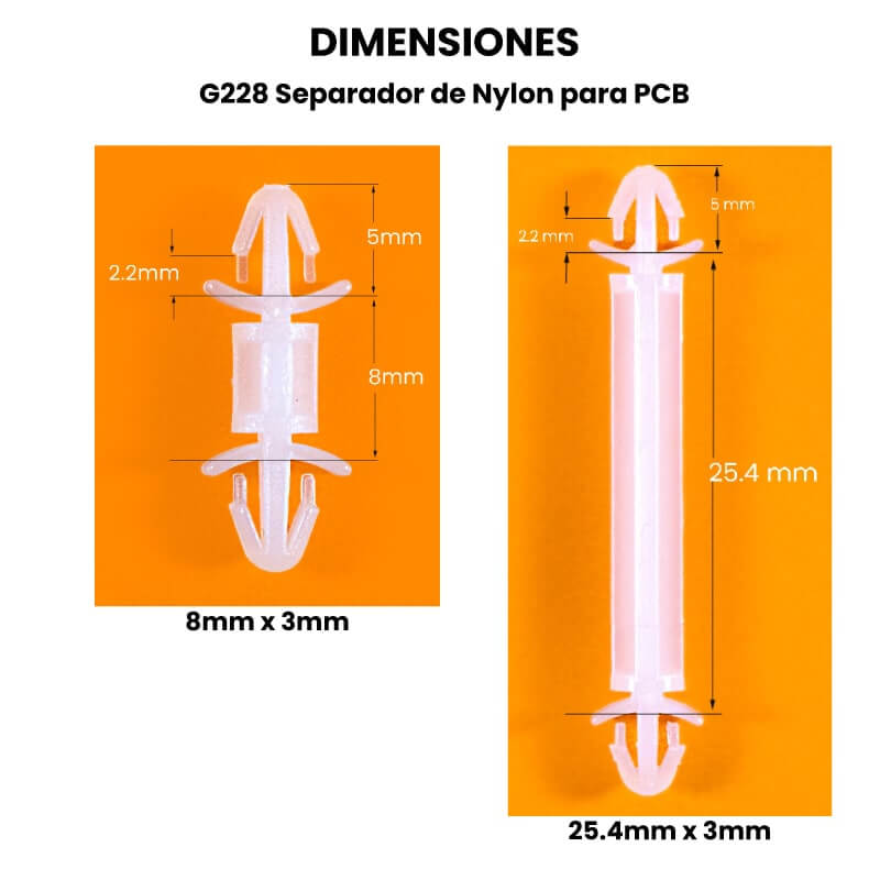 El G228 separador de nylon Es útil para tener en espacio entre PCBs, considerando que el espacio será de 8mm o 25mm, según sea la necesidad de su proyecto.