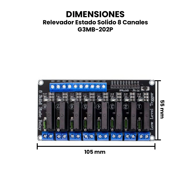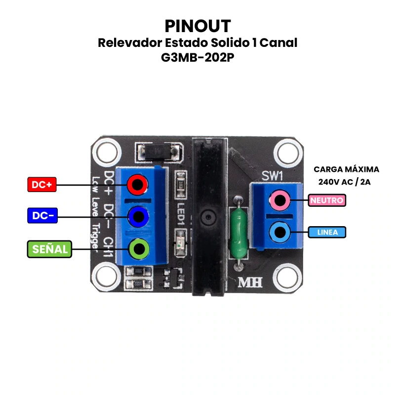 El G3MB-202P es un relevador de estado sólido (SSR) ampliamente utilizado en proyectos de automatización y control debido a su capacidad para manejar cargas de corriente alterna sin partes móviles, lo que lo hace silencioso, duradero y confiable. Permite controlar múltiples dispositivos de manera simultánea, como luces, electrodomésticos, motores pequeños y sistemas de climatización. Se utilizan comúnmente en aplicaciones de domótica, control industrial, automatización de procesos y sistemas de energía inteligente. Su diseño permite una fácil integración con placas de desarrollo como Arduino (Uno, Mega, Nano), ESP8266, ESP32, y también Raspberry Pi, ya que requieren muy poca corriente de activación y operan con niveles lógicos compatibles (3.3V o 5V). Gracias a su aislamiento optoacoplado, ofrecen una mayor seguridad al controlar cargas de corriente alterna desde microcontroladores de bajo voltaje.