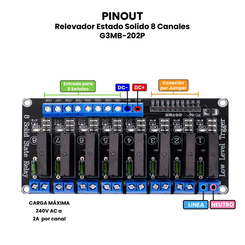 Para usar los módulos de relevadores de estado sólido G3MB-202P (en versiones de 1, 2, 4 u 8 canales), primero es importante entender que estos dispositivos permiten controlar cargas de corriente alterna (AC) —como lámparas, ventiladores o pequeños electrodomésticos— usando señales de bajo voltaje en corriente directa (DC) provenientes de un microcontrolador, como Arduino o ESP32.