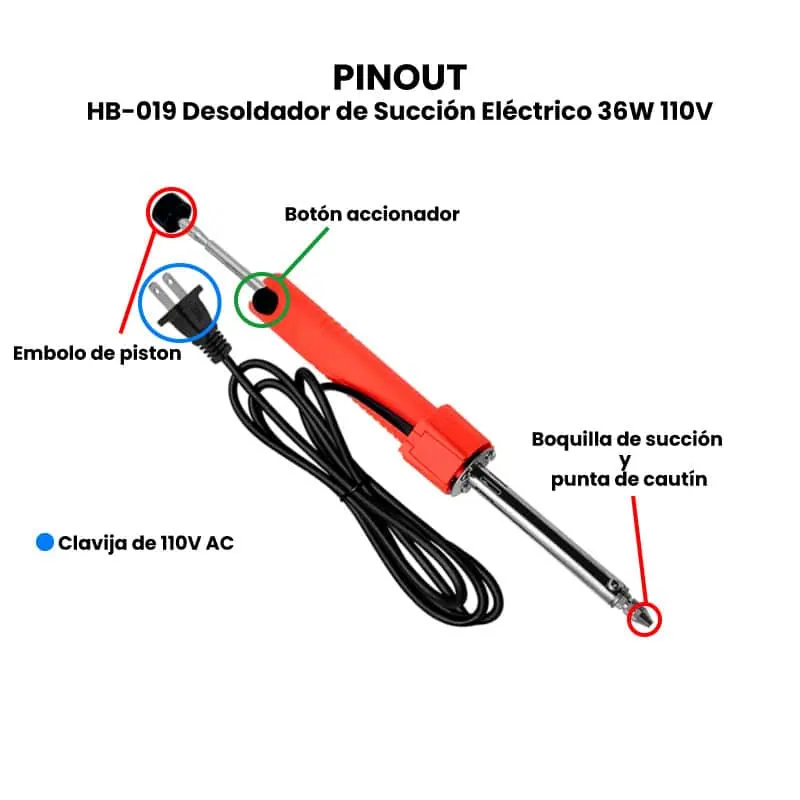 Este desoldador funciona a 110V y tiene una potencia de 36W, lo que proporciona un calentamiento eficiente sin dañar los componentes electrónicos. Gracias a su mecanismo de resorte con botón, permite liberar rápidamente el vacío para succionar el estaño caliente. Es una herramienta muy útil para técnicos, estudiantes de electrónica y aficionados que necesitan reemplazar componentes o corregir errores en sus proyectos.