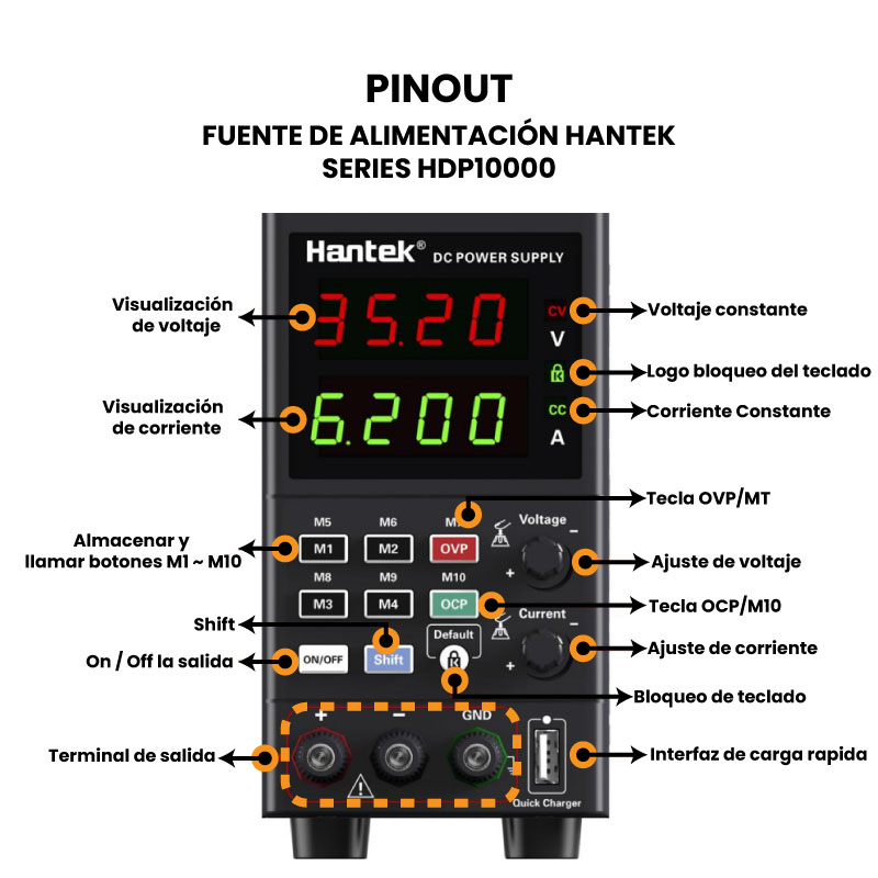 - Pantalla de voltaje y corriente de cuatro dígitos , resolución de hasta 10 mV/1 mA.