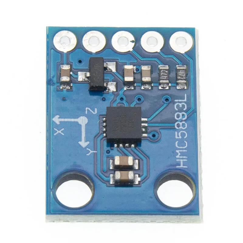 El HMC5883L Módulo es un Magnetómetro de tres ejes (X, Y y Z) de cinco pines, que trabaja con protocolo de comunicación I2C y un rango de medición desde ± 1.3 hasta 8 gauss, cuenta con dos modos de medición (continua y única), se alimenta con voltaje de 3.3 o 5V.