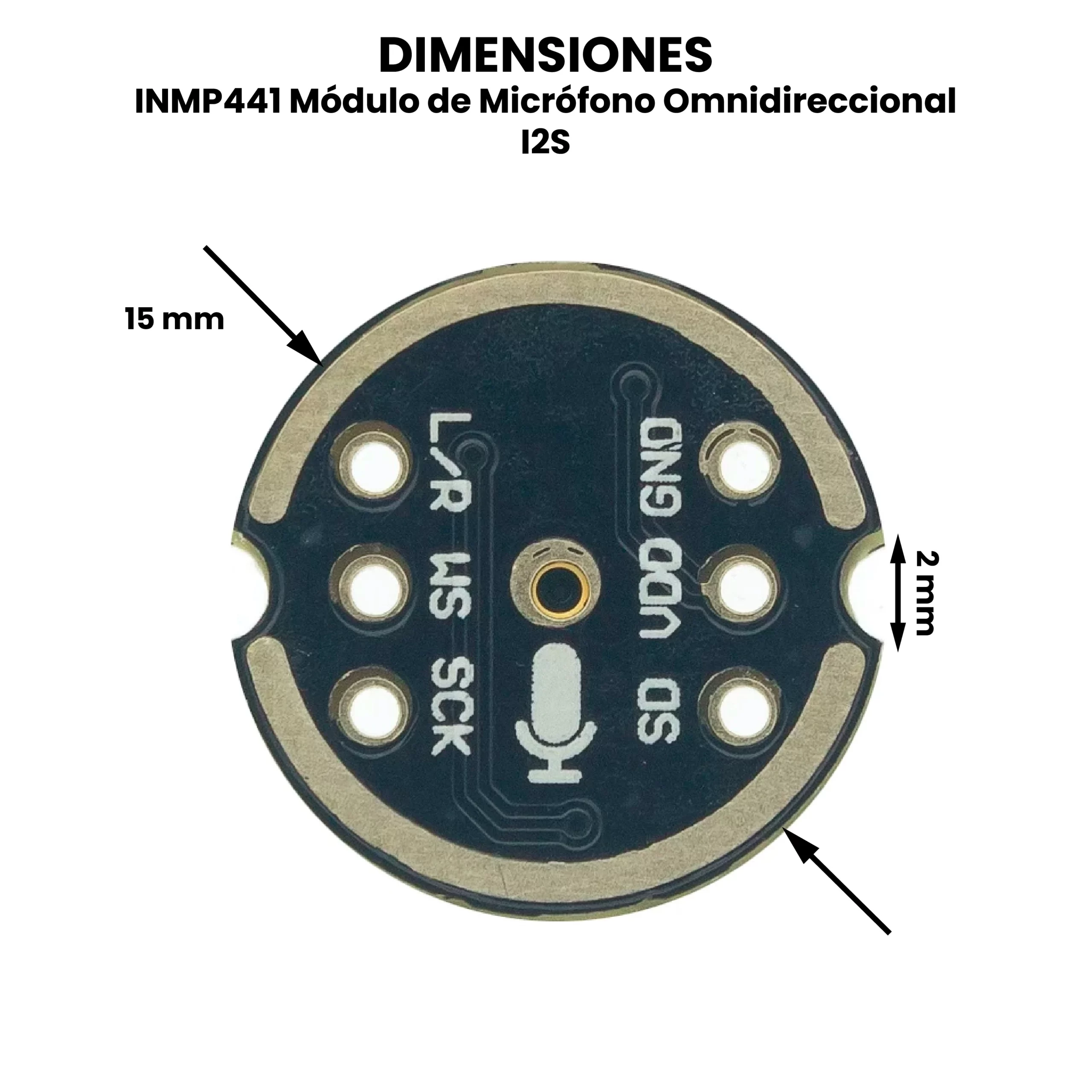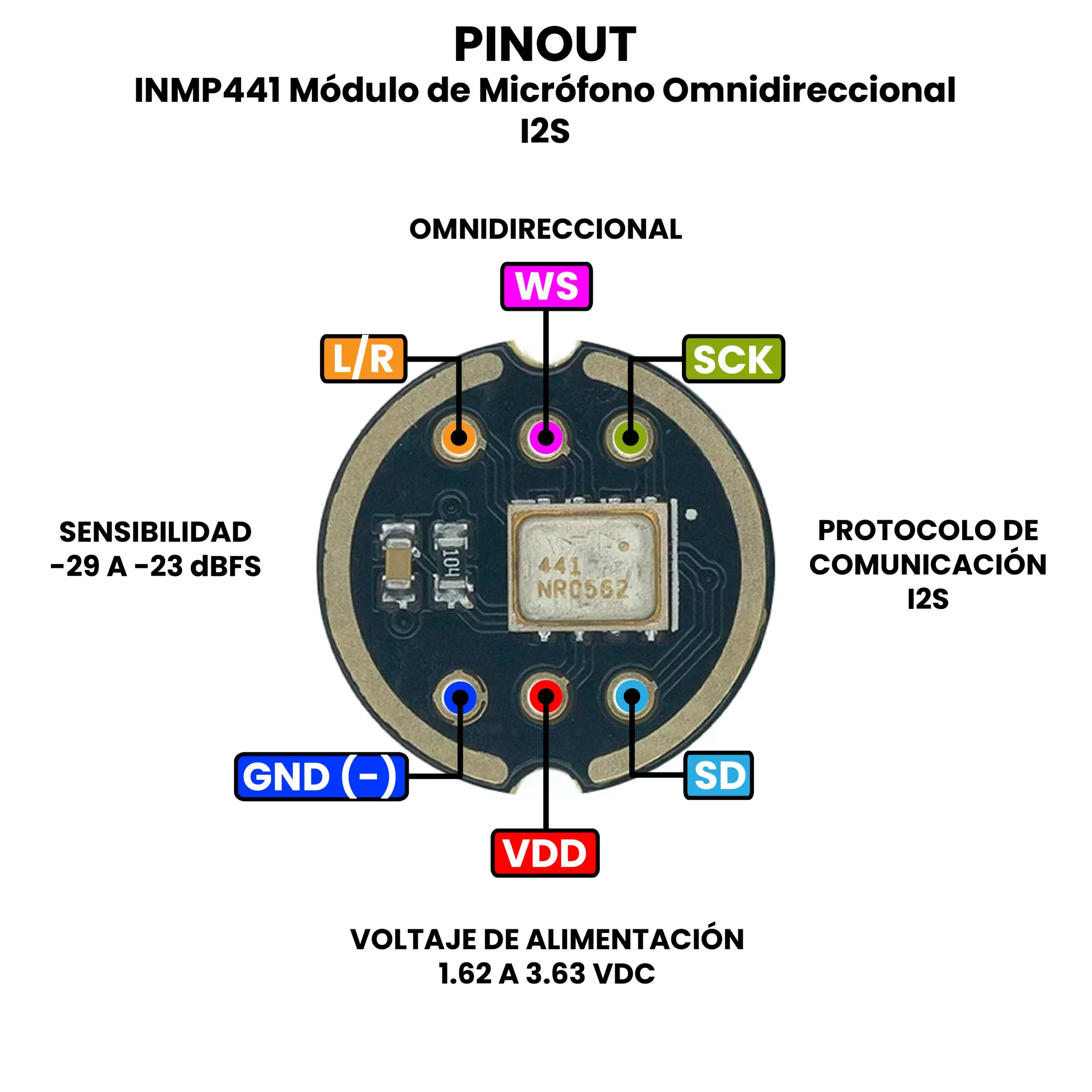 El INMP441 Módulo de Micrófono Omnidireccional I2S es un sensor de audio digital basado en un micrófono MEMS (Micro-Electro-Mechanical System) capaz de captar sonido desde todas las direcciones con alta sensibilidad y bajo nivel de ruido. A diferencia de los micrófonos analógicos tradicionales, este módulo integra un convertidor analógico-digital interno que transforma directamente las ondas sonoras en señales digitales mediante el protocolo de comunicación I2S (Inter-IC Sound).
