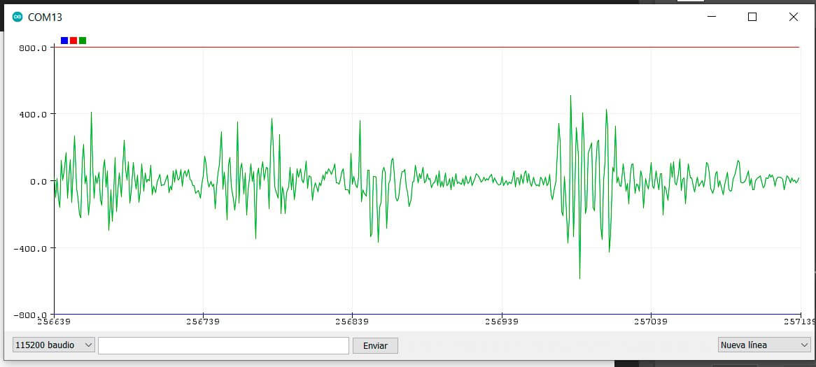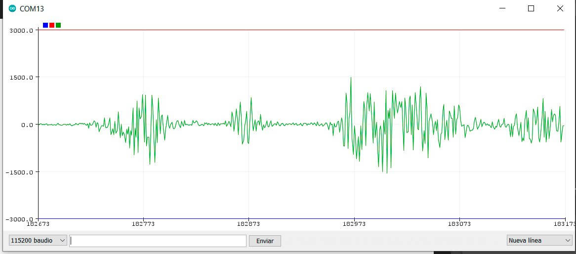 Una vez cargado el código, el micrófono comenzará a detectar sonido y a enviar estos datos al microcontrolador, para visualizar los datos que recibe el micrófono solo basta con abrir el graficador serial del IDE: