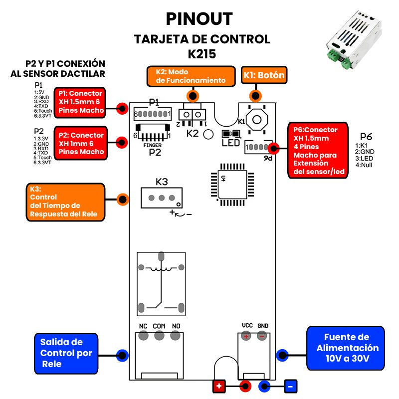 K215 Controlador de Huellas y R503 Sensor Dactilar permiten tener un sistema de control de acceso por medio de la identificación de huellas dactilares, estos dispositivos son de bajo consumo de energía, compactos y fácil de utilizar.