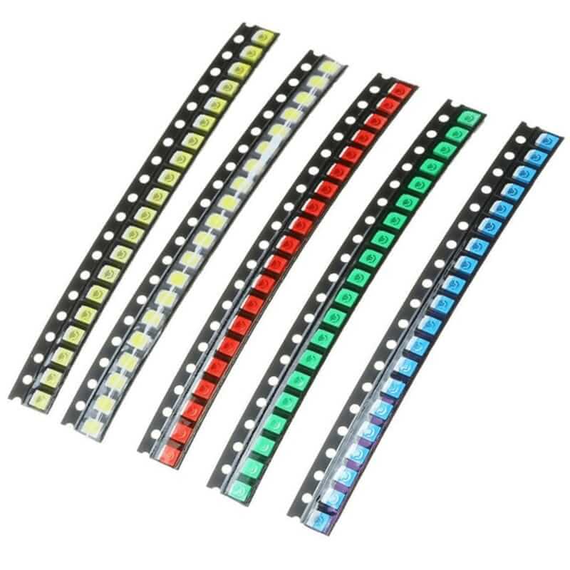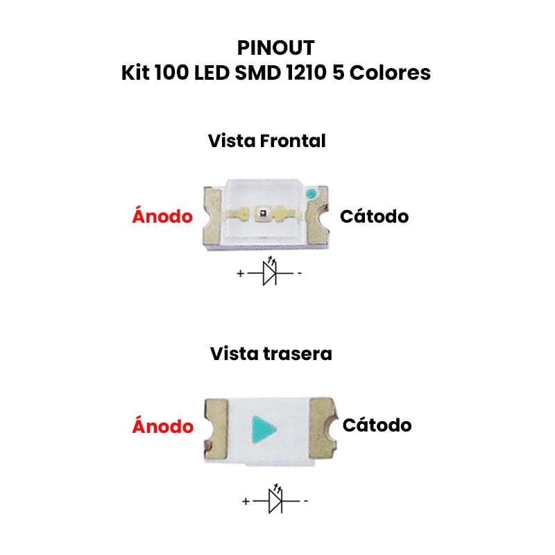 Los LED SMD 1210 son diodos emisores de luz en los cuales los diodos están montados directamente sobre la superficie. El kit de 100 leds smd incluye cinco colores diferentes: blanco, azul, rojo, amarillo y verde; 20 piezas por cada color.