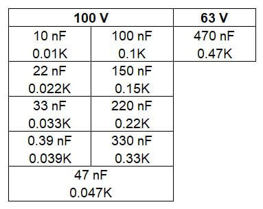 Kit de Capacitores Polipropileno incluye un estuche de plástico con 15 divisiones, cada uno con 10 piezas de diferentes valores, siendo un total de 150 piezas. Están fabricados con película de polipropileno CBB y manejan tensión nominal de 100V y 63V.