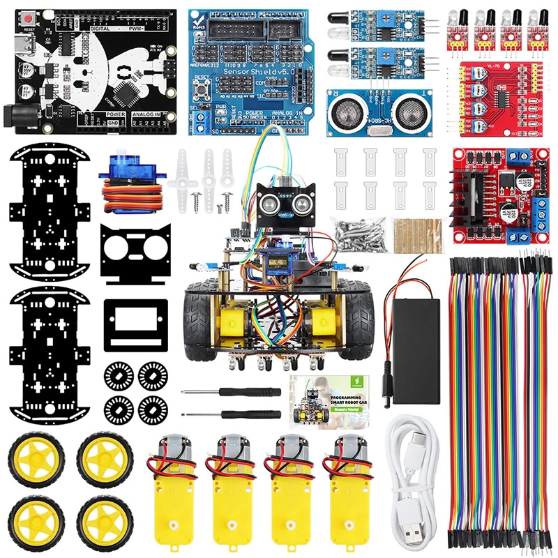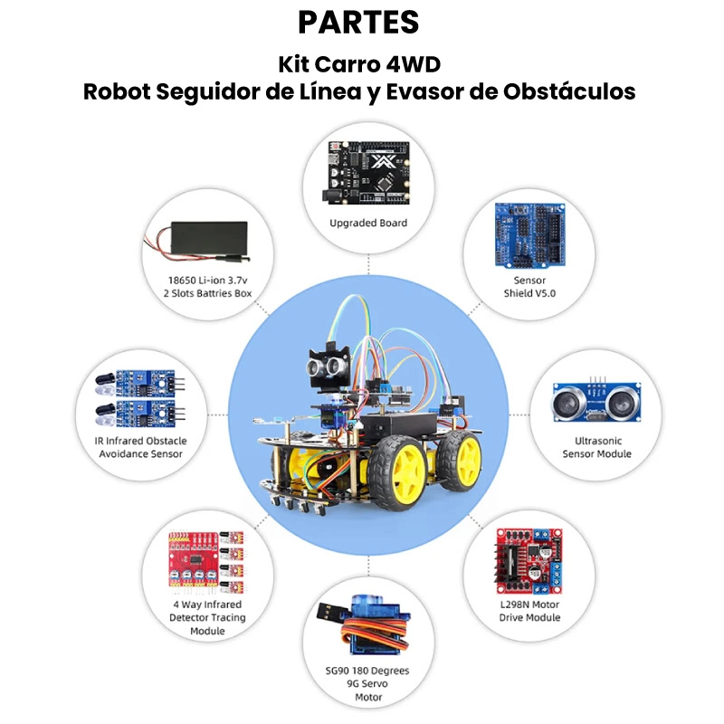 El Kit Carro 4WD Robot es un kit educativo diseñado para armar un robot móvil con función de seguidor de línea y evasor de obstáculos. Incluye:
