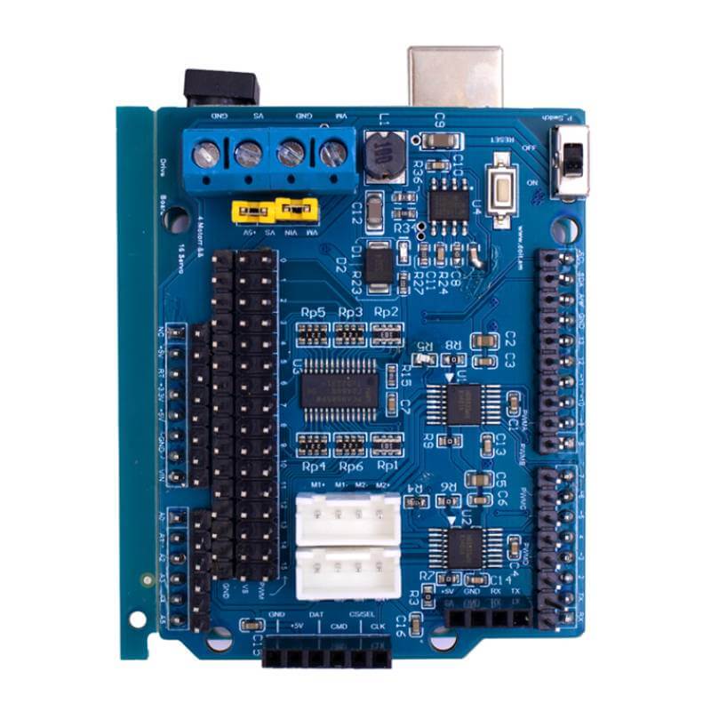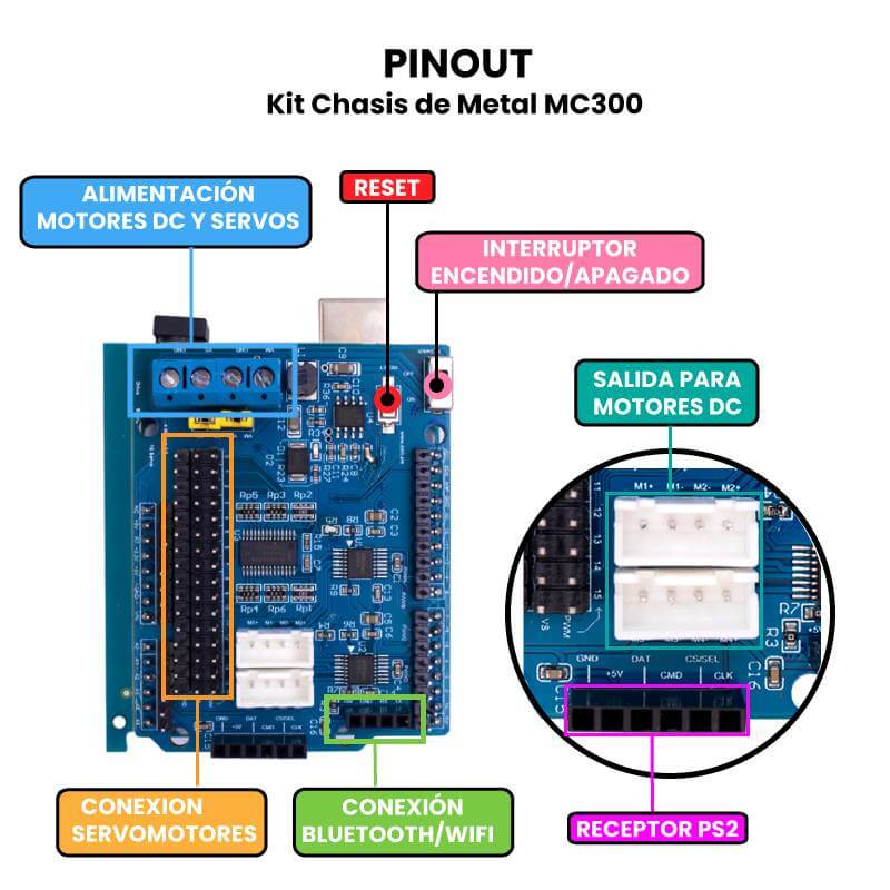 - Shield de expansión: Se utiliza para realizar las conexiones de los cuatro motores y el receptor , asegurando que todo funcione correctamente.