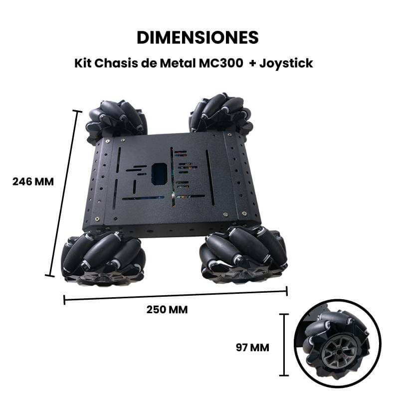 El Kit Chasis de Metal MC300 con Llantas Omnidireccional + Joystick es ideal para aplicaciones que requieren movimientos complejos y precisos como,: competiciones de robótica, investigación y desarrollo de prototipos o educación en tecnología permite una fácil integración de los motores, controladores y sensores, lo que lo convierte en una opción versátil tanto para aficionados como para profesionales en robótica.