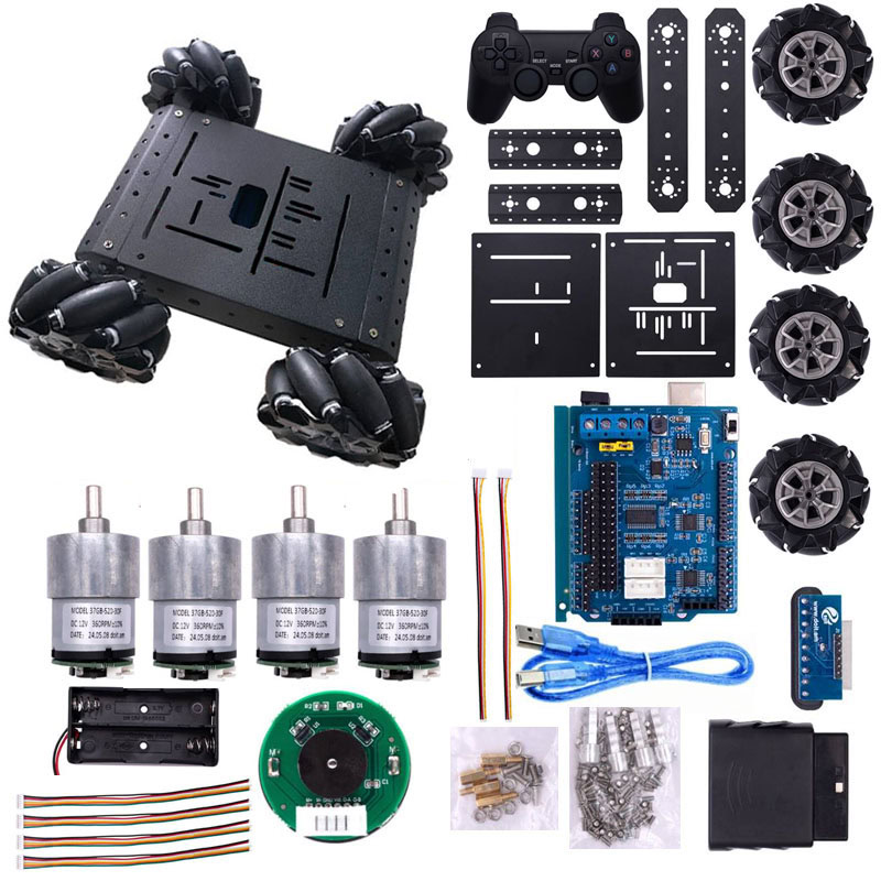 El Kit Chasis de Metal MC300 con Llantas Omnidireccional + Joystick ofrece todo para la construcción de un carro o robot móvil con la movilidad en cualquier dirección por control inalámbrico y programación en Arduino; ya que incluye: