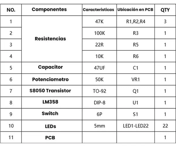 Chip LM358 (IC): Observa la muesca (semicírculo) o el punto en uno de los extremos del chip. Debe coincidir con el dibujo de la muesca en la placa (PCB).