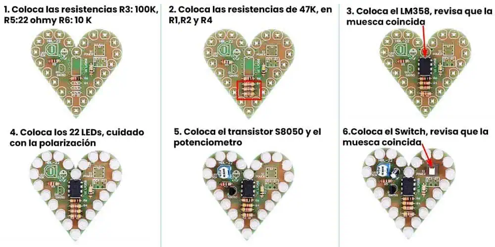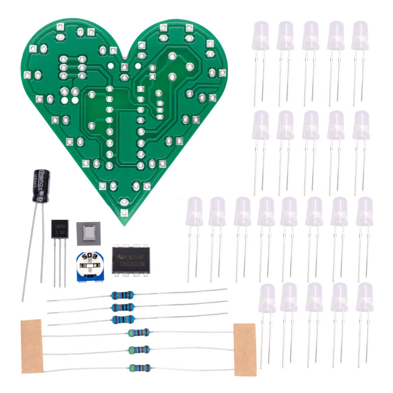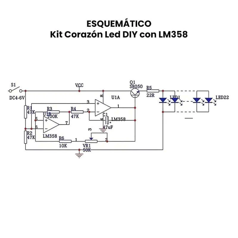 El Kit Corazón Led DIY con LM358 es un conjunto de componentes útiles para ensamblar en la PCB leds que tendrán forma de corazón y al energizarlo (4 V a 6 V) realizaran un efecto de “luz de respiración” o parpadeo rítmico; esto gracias al doble amplificador operacional LM358. El kit incluye: