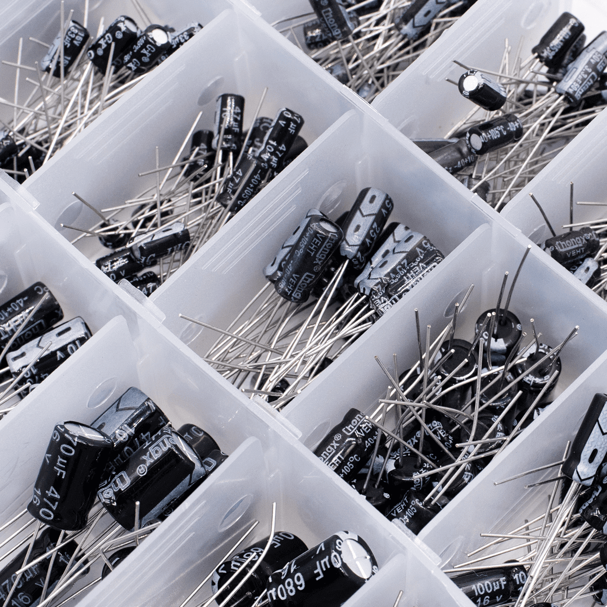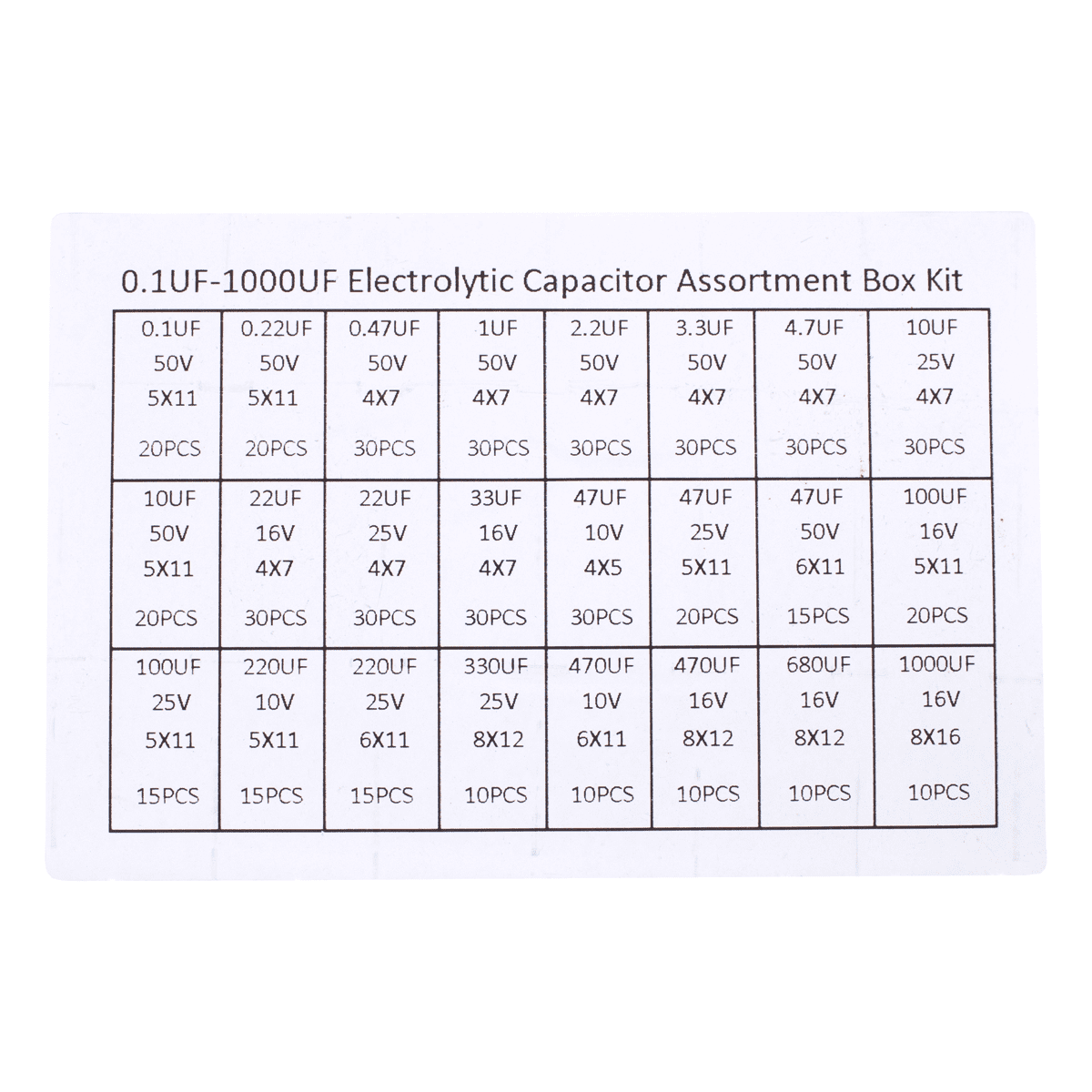 Kit de capacitores electrolíticos con 510 piezas, viene integrado en un estuche con un total de 24 valores de los más utilizados en electrónica, cada capacitor es de montaje THT y vienen con valores de 10, 16, 25 y 50 V.