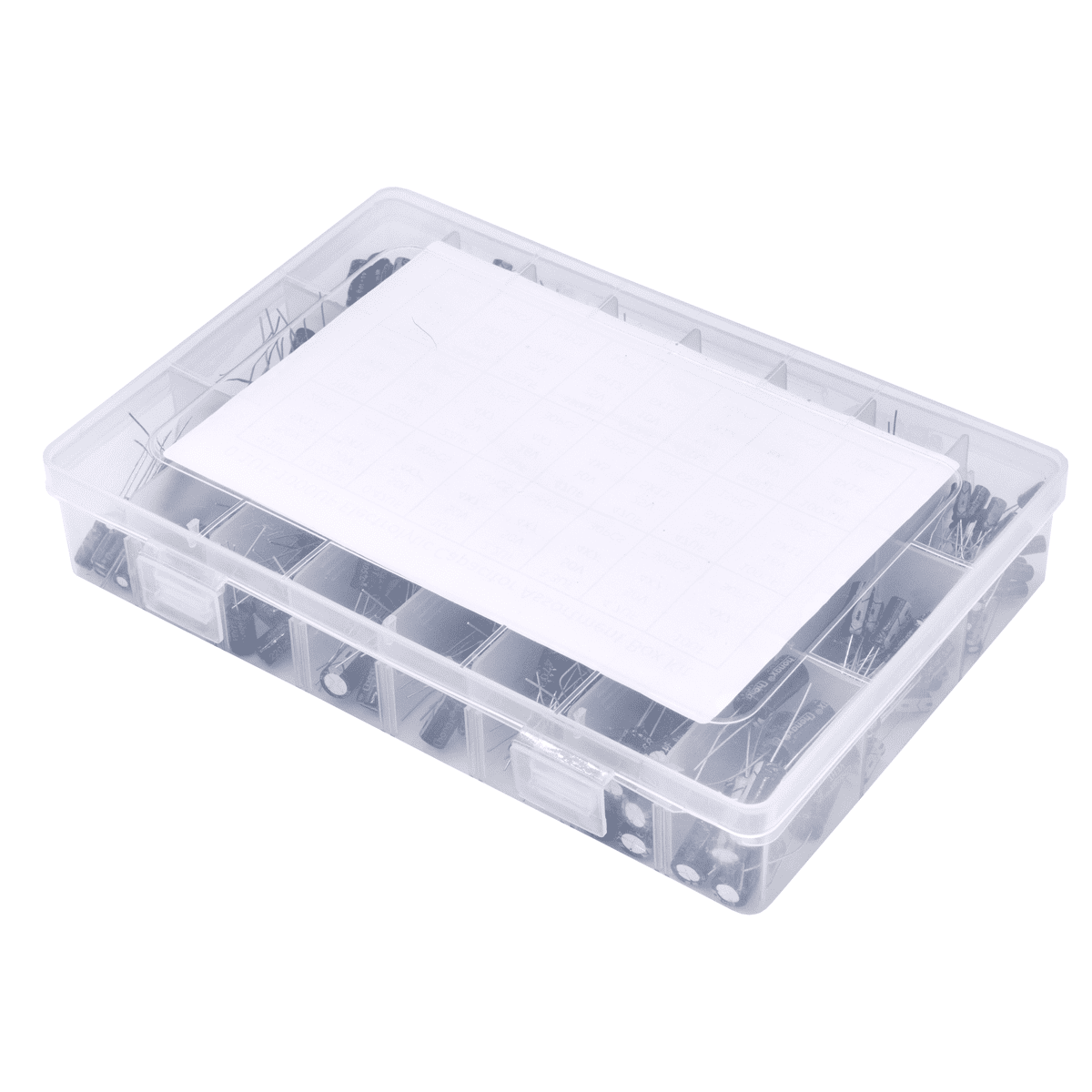 El kit de capacitores electrolíticos incluye compartimientos para mantener separados los capacitores, también tiene un seguro para mantenerlo cerrado y evitar que se pierdan los capacitores.