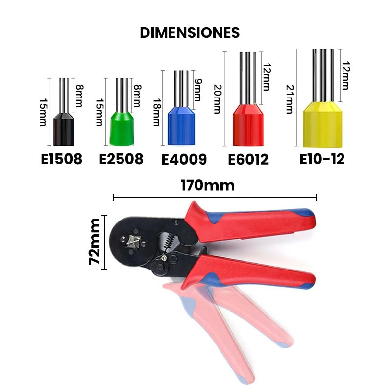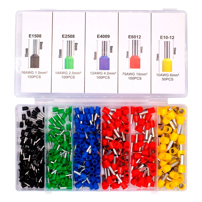 El Kit de Terminales 450 pz con Crimpadora HSC8 6-4A contiene 450 piezas de terminales de prensado en frío tipo europeo con forma de aguja en diferentes 5 modelos: E1508(100 pz),E2508(100 pz),E4009(100 pz),E6012(100 pz) y E10-12(50 pz), contenidas en una caja de plástico para fácil almacenamiento e incluye la crimpadora.