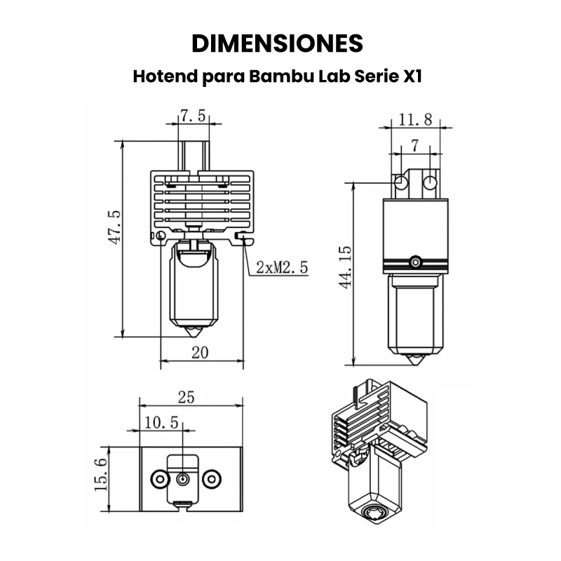 - Hotend: 47.5mm x 25mm x 15.6mm