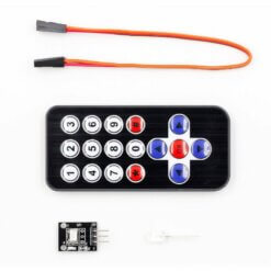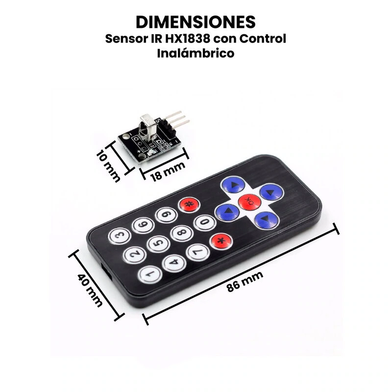 El Sensor IR HX1838 con Control Inalambrico es un conjunto diseñado para recibir señales infrarrojas desde un control remoto, facilitando la interacción a distancia con microcontroladores. Este kit incluye un módulo receptor IR (basado en el sensor HX1838 montado en una placa KY-022), un control remoto IR tipo NEC (NO INCLUYE BATERÍA) y cables Dupont para facilitar las conexiones. Su funcionamiento se basa en la recepción de señales moduladas a 38 kHz emitidas por el control remoto; el receptor detecta la señal, la filtra y la convierte en una salida digital que puede ser interpretada por el microcontrolador.