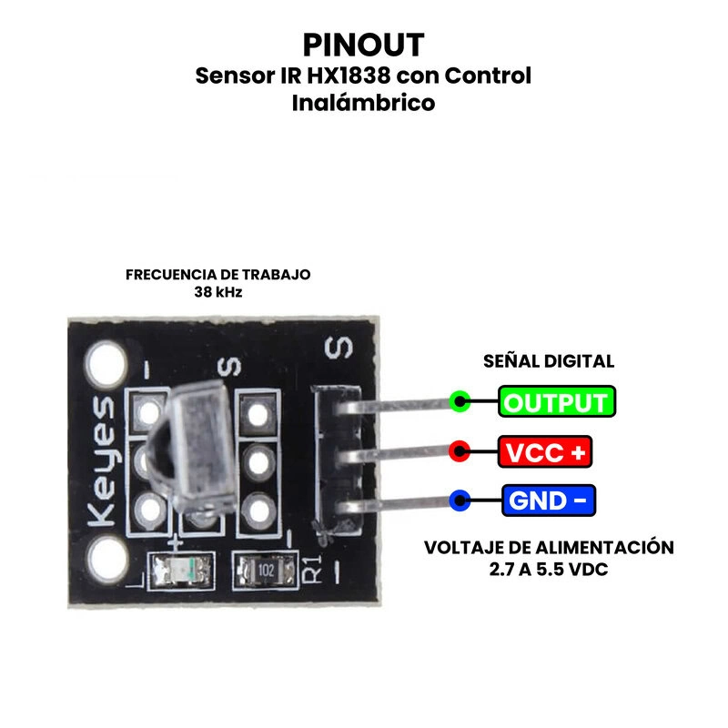 - Tipo de señal de salida: Digital (HIGH cuando no recibe señal, LOW cuando detecta).
