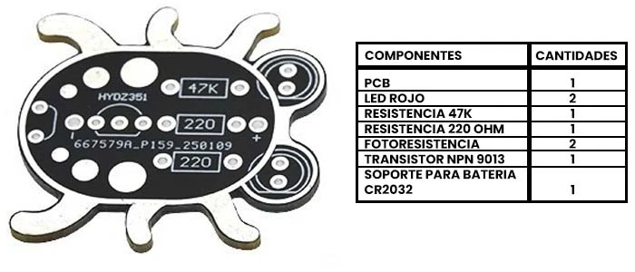 El Kit Weevil Eye Control de luz por fotorresistencia DIY es un pequeño robot con forma de insecto (un gorgojo o escarabajo) cuyos “ojos” (dos LEDs) reaccionan a la luz ambiental por medio de la fotorresistencia. Este Kit incluye una placa de circuito impreso (PCB) que tiene la forma del insecto y una serie de componentes básicos THT (resistencias, transistores, LEDs y una fotorresistencia) que tú mismo debes soldar.