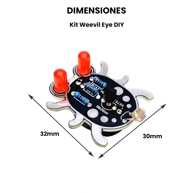 El Kit Weevil Eye Control de luz por fotorresistencia DIY es un pequeño robot con forma de insecto (un gorgojo o escarabajo) cuyos “ojos” (dos LEDs) reaccionan a la luz ambiental por medio de la fotorresistencia. Este Kit incluye una placa de circuito impreso (PCB) que tiene la forma del insecto y una serie de componentes básicos THT (resistencias, transistores, LEDs y una fotorresistencia) que tú mismo debes soldar.