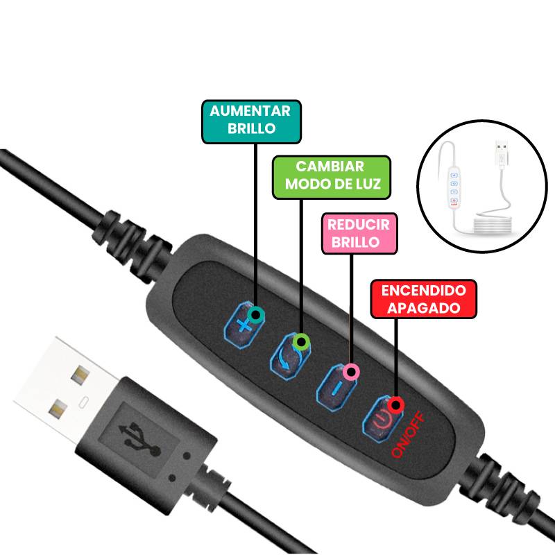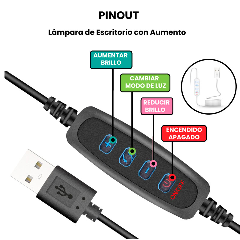- Cable de alimentación: Se conecta la lámpara LED a un puerto USB de 5V.
